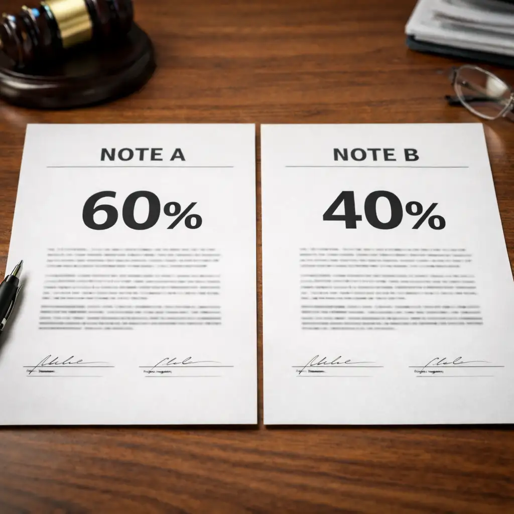 Note B represents the remaining 40% of the balance, carries zero interest, requires no monthly payments, and remains outstanding until a qualifying title-related event occurs.
